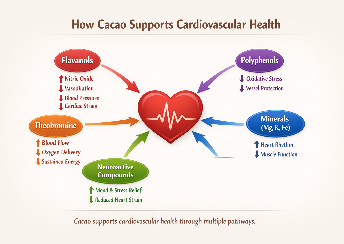 Cacao’s primary alkaloid is theobromine, not caffeine. And theobromine primarily acts on the cardiovascular system, not the brain. Instead of forcing alertness, it supports circulation. It gently relaxes blood vessels, improves blood flow, and enhances oxygen delivery to tissues—creating a steady, grounded sense of energy without pushing the heart into overdrive.