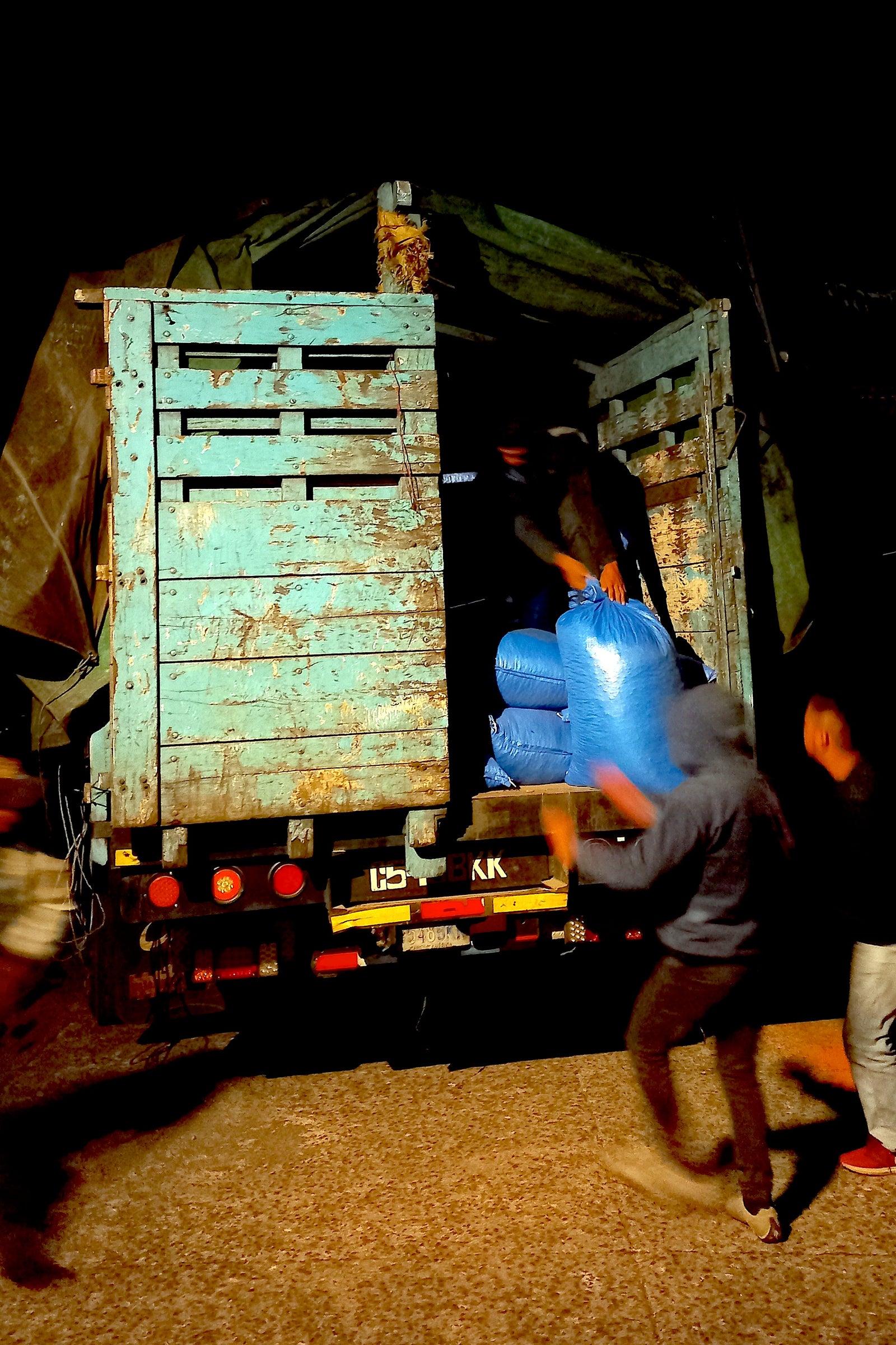 When the trucks finally arrived at the taller, it was 11 pm. They were huge and loaded! How on earth would all these sacks fit into the taller was beyond me. But more than anything, what was truly beyond and absolutely amazing for me was the commitment, the zest, the fervor, and the coordinated teamwork of the people making this delivery happen.