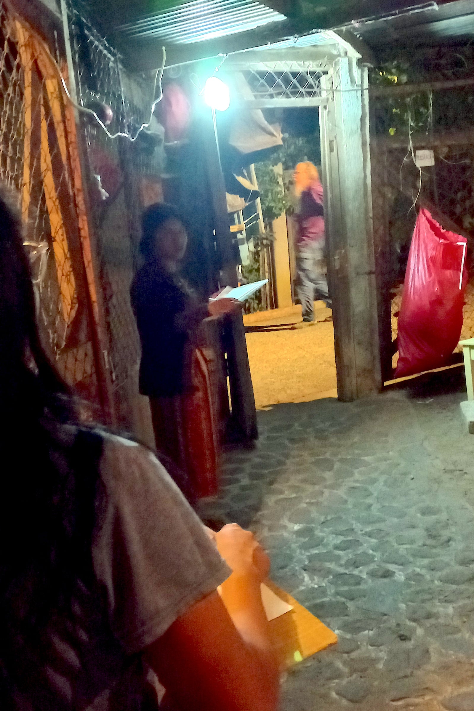 And lo and behold, news came in at 7 pm. The trucks made it through the roadblocks and would be arriving in San Marcos in two hours. The ball was rolling again. It was getting dark, so Keith and Barbara got to setting up some special lights around the taller bodega and along the road. Rosalinda, the taller supervisor, called everyone and asked them to be at the taller by 8:30. Andrés, Gise, and I went looking for pizza and some Cola. There were 9 guys in the cacao trucks, exhausted and starved, and another 9 people at the taller working late hours. The least we could do was feed them.