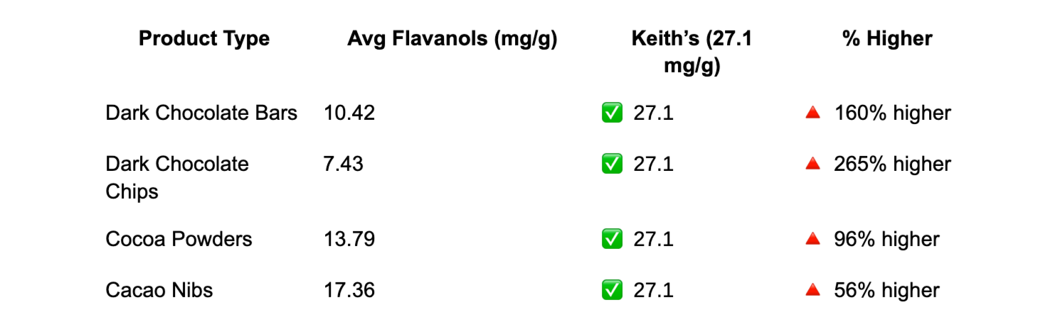 Keith’s Cacao consistently delivers among the highest flavanol concentrations of any product on the market — and does so without the additives or variability common in supplements.