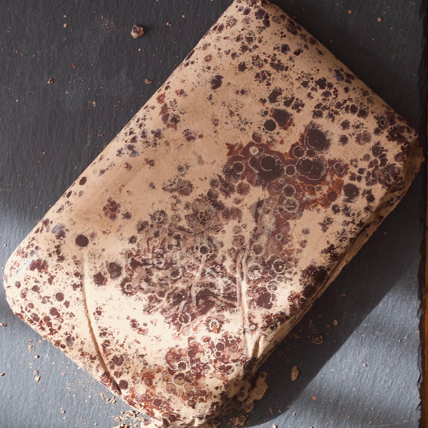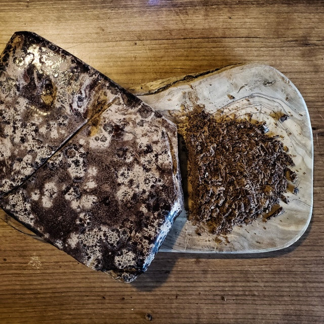 “We do not temper our Cacao, a process that alternately heats and cools the chocolate to ‘crystallize’ it and prevent cacao butter separation. After packaging, the cacao butter begins to separate in the blocks, first forming swirls or white rings (looks like it might be mold – it isn’t!) and eventually turning the entire block dusty grey and crumbly. This is completely normal. The changing texture does not affect the ceremonial quality or the flavor of the Cacao.”